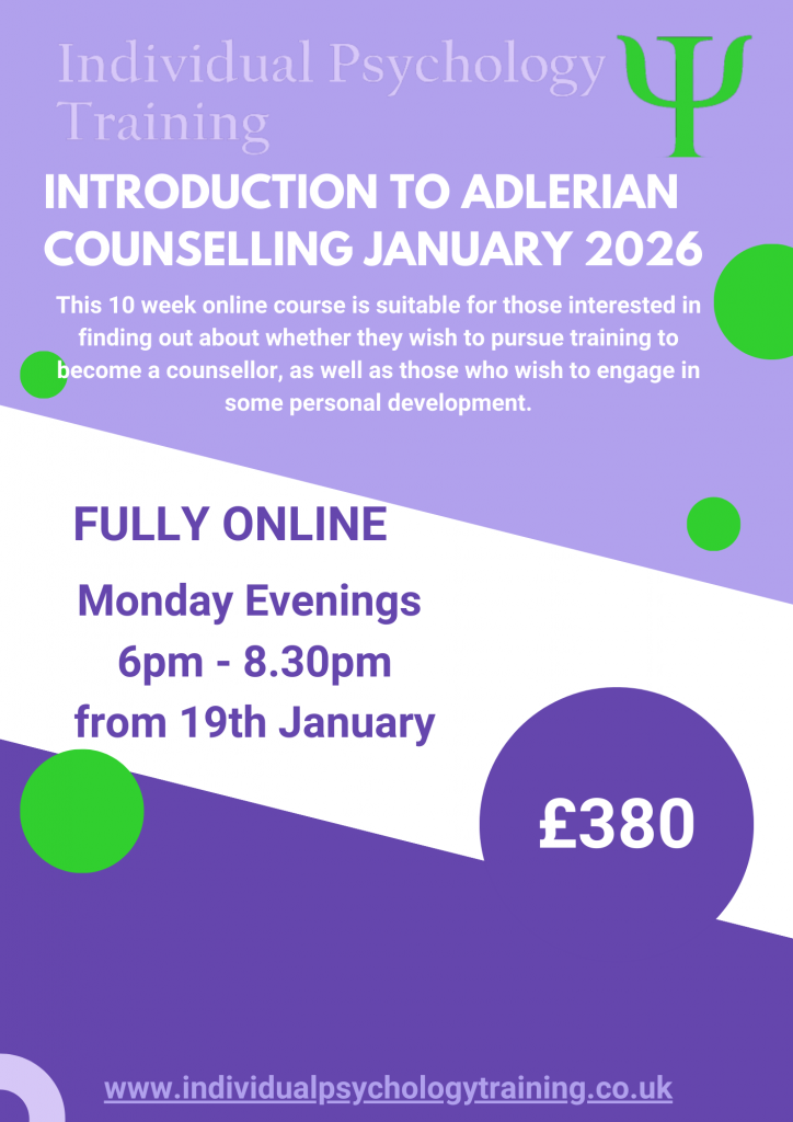 Individual Psychology Training runs Introductions to Adlerian Psychology courses throughout the year. These courses are suitable for anyone with an interest in self-development, or learning more about Adlerian psychology, as well as for those intending to progress to a counselling qualification.